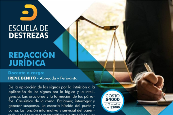 La propuesta que traen en esta oportunidad es la capacitación en ´Redacción jurídica´. La misma inicia el 19 de octubre y finaliza el 11 de novienbre de este año, se dictará en 8 clases, los días martes y jueves de 14.30 a 16 hs. Docente a cargo: abogada y periodista Irene Benito. Auspician/Organizan: Facultad de Derecho y Cs. Sociales UNT, Secretaría de Planificación E Innovación Universitaria y Centro de Graduados - Derecho UNT.
