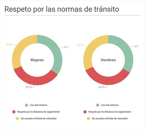 Además, ellas respetan más las normas de tránsito. El 96% de las mujeres usa el cinturón de seguridad, contra el 88% de los hombres. Lo mismo ocurre con la distancia de seguimientoentre auto y auto. Además, el 85,7% de las mujeres no excede el límite de velocidad contra el 83,2% del sexo opuesto.