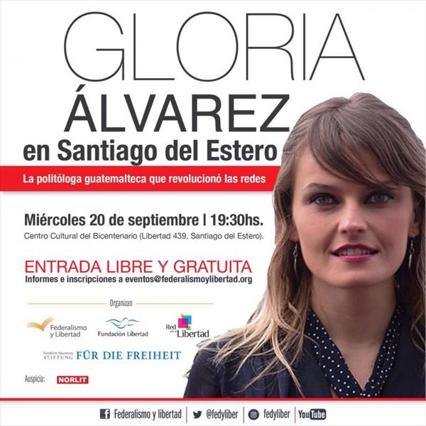 La Fundación Federalismo y Libertad y la Red por la Libertad invitan a la conferencia de la reconocida politóloga guatemalteca Gloria Álvarez. El evento se realizará hoy miércoles 20 de septiembre a las 19,30 en el Centro Cultural del Bicentenario (Libertad 439, Santiago del Estero).