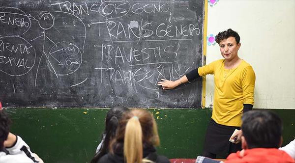 alumnos, en la escuela Silvano Bores. Ella es la primera mujer trans que se
