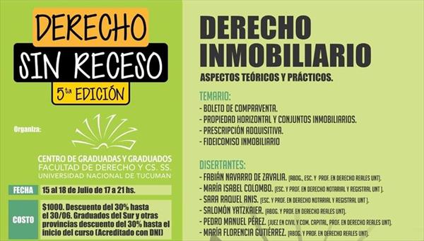 Derecho sin Receso es un ciclo de capacitaciones que se dictarán en la Facultad de Derecho U.N.T, el cual contará con 6 cursos, uno de ellos “Derecho Inmobiliario: aspectos teóricos y prácticos.
