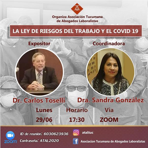 Desde la Asociación Tucumana de Abogados Laboralistas convocan a interesados en la temática, para el día lunes 29 de junio, a 17:30 hs. a una charla virtual vía Zoom sobre La Ley de Riesgo del Trabajo y el COVID 19"