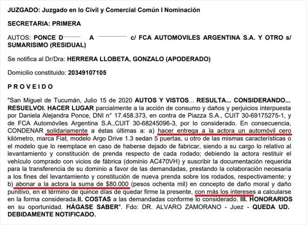 oficial entrega nuevamente el Fiat Argo a la demandante pero días después, la