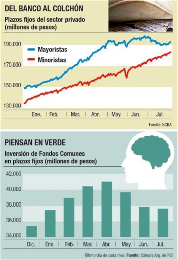 Hay otras dos cuestiones que llaman ahora la atención en muchas mesas de dinero. La primera: que el retroceso se vea en un momento en que se advierten fuerte crecimiento de la liquidez y falta de proyectos de inversión de compañías (hoy a la expectativa de que se aclare el panorama pasadas las elecciones de octubre). La segunda: que la dinámica sea diferente, por ahora, en los ahorristas minoristas: los plazos fijos menores al millón de pesos, que hasta el 24 de julio (último dato disponible) pagaban una tasa de interés dos puntos porcentuales mayor (22,6%), mostraron una tendencia creciente similar a la de los meses anteriores.