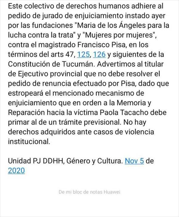 trata“ y “Mujeres por mujeres“ contra el magistrado Francisco Pisa, en los