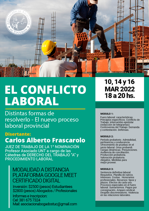 Desde la Asociación de Abogados Tucumán invitan a participar del Curso Online: EL CONFLICTO LABORAL: “Distintas formas de resolverlo - El nuevo proceso laboral provincial”. Se dictará por la plataforma de Google Meet y se entregará certificación digital.