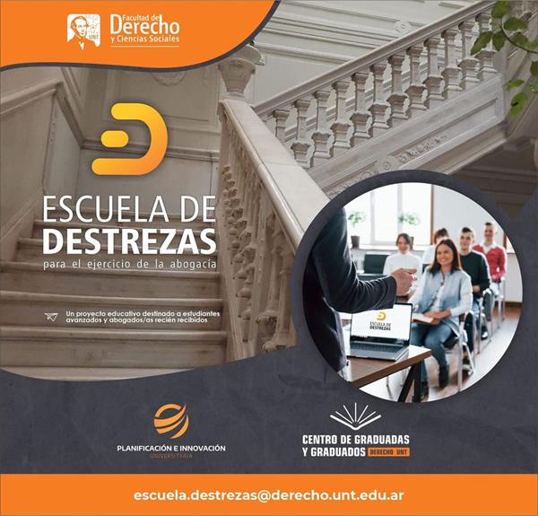 La Escuela de Destrezas es un Proyecto del Centro de Graduados y Graduadas de la Facultad de Derecho y Ciencias Sociales de la UNT, organizado bajo la órbita de la Secretaría de Planificación e Innovación Universitaria.